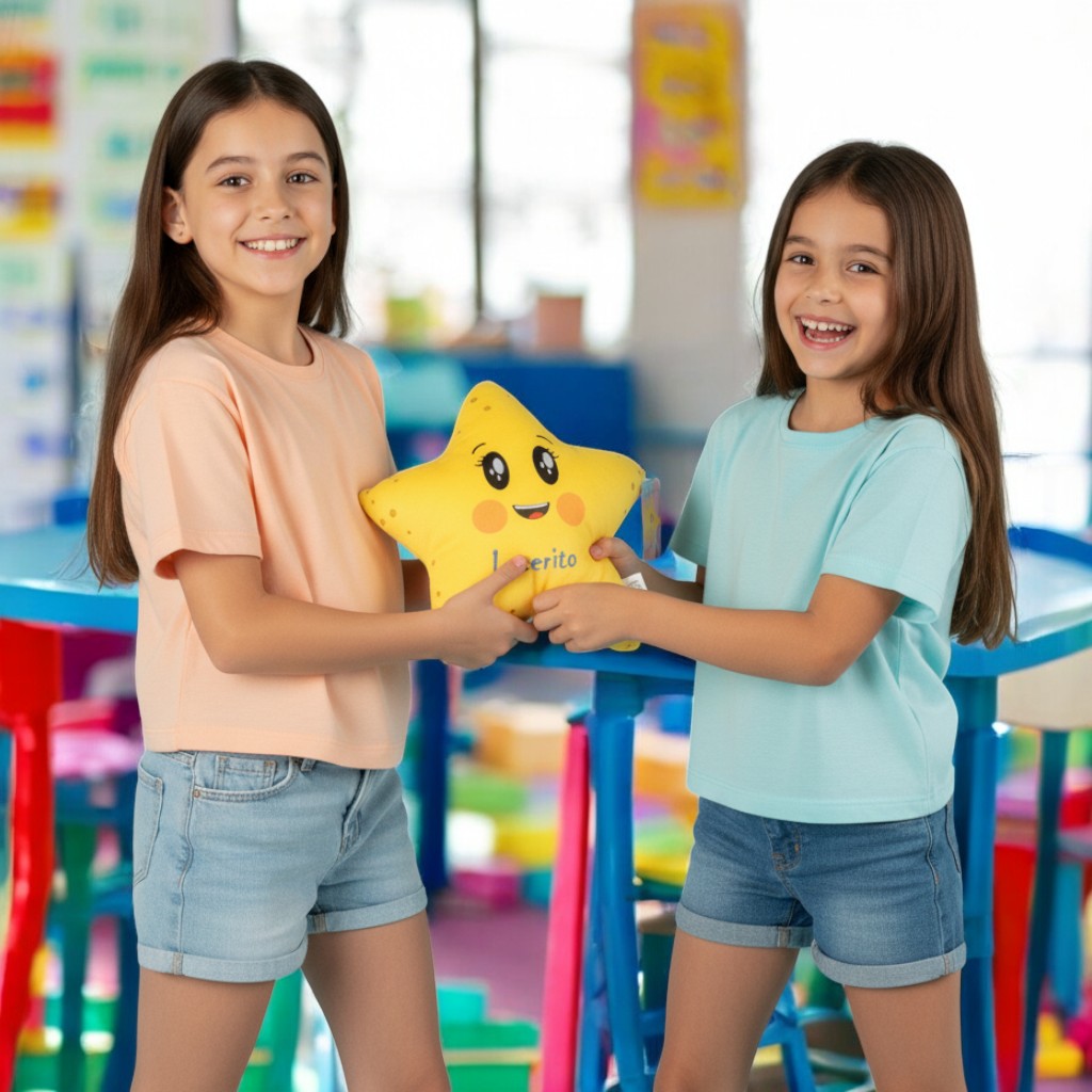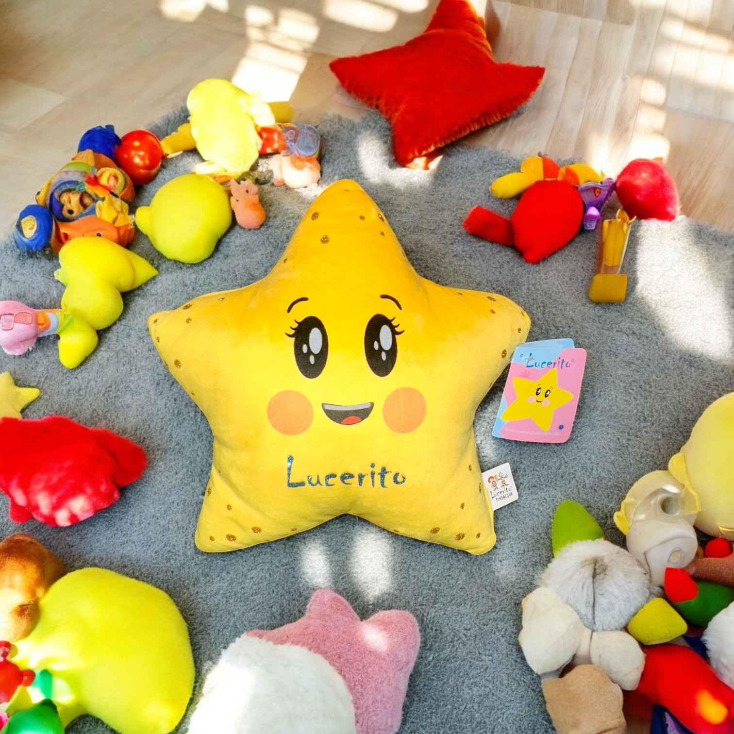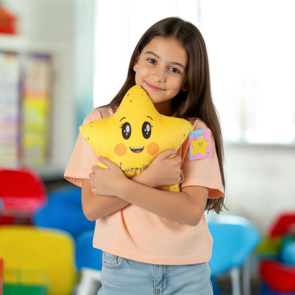 La Estrella Cojín representa el lucero que guía el camino de la Fundación Lucerito. Su textura suave y su forma tierna invitan al abrazo, transmitiendo seguridad y compañía.